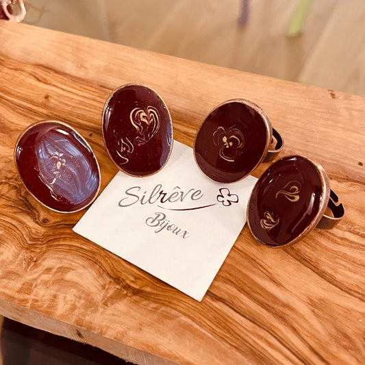 Oval copper ring, adjustable, hand painted and vitrified