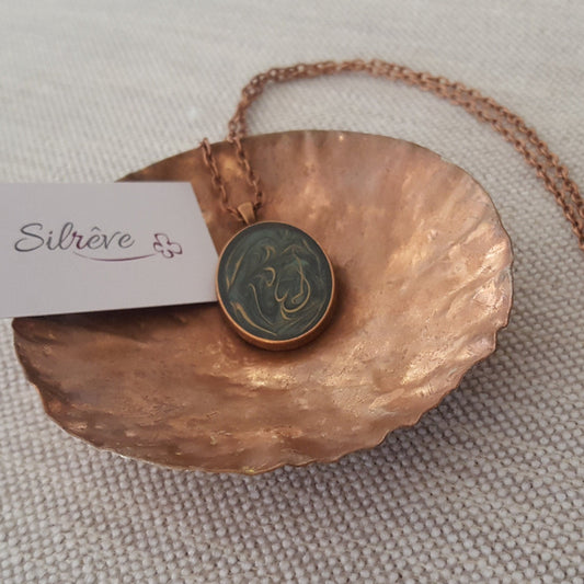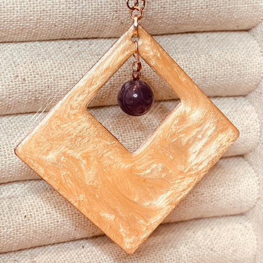 Copper necklace with square pendant, embellished with amethyst pearl.
