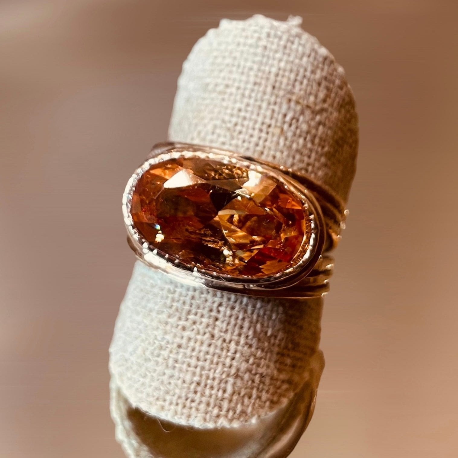 Anello in bronzo diamantato interamente realizzato a mano con incastonata una gemma di quarzo citrino molto luminosa nei suoi giochi di luce; pezzo unico.