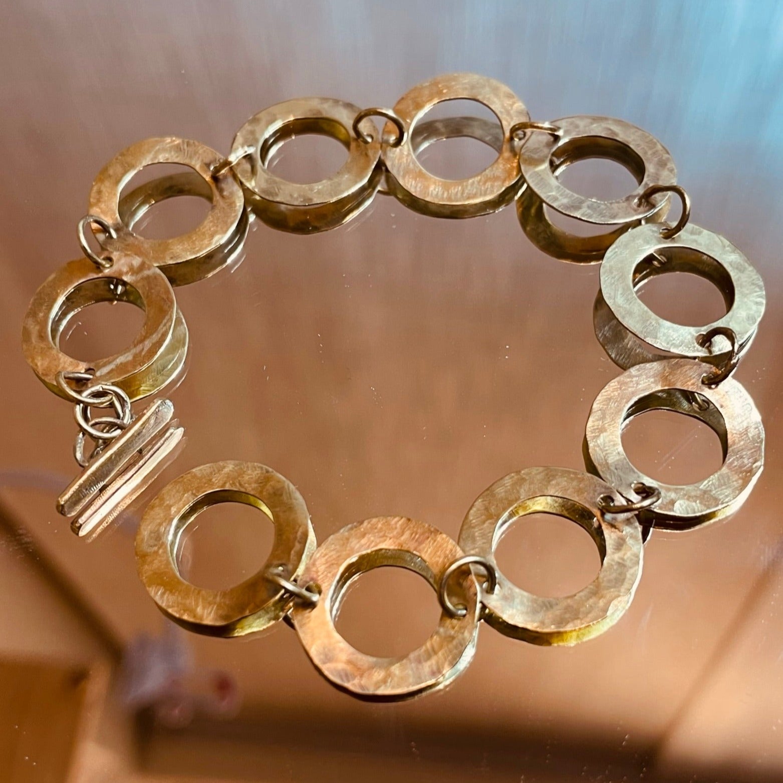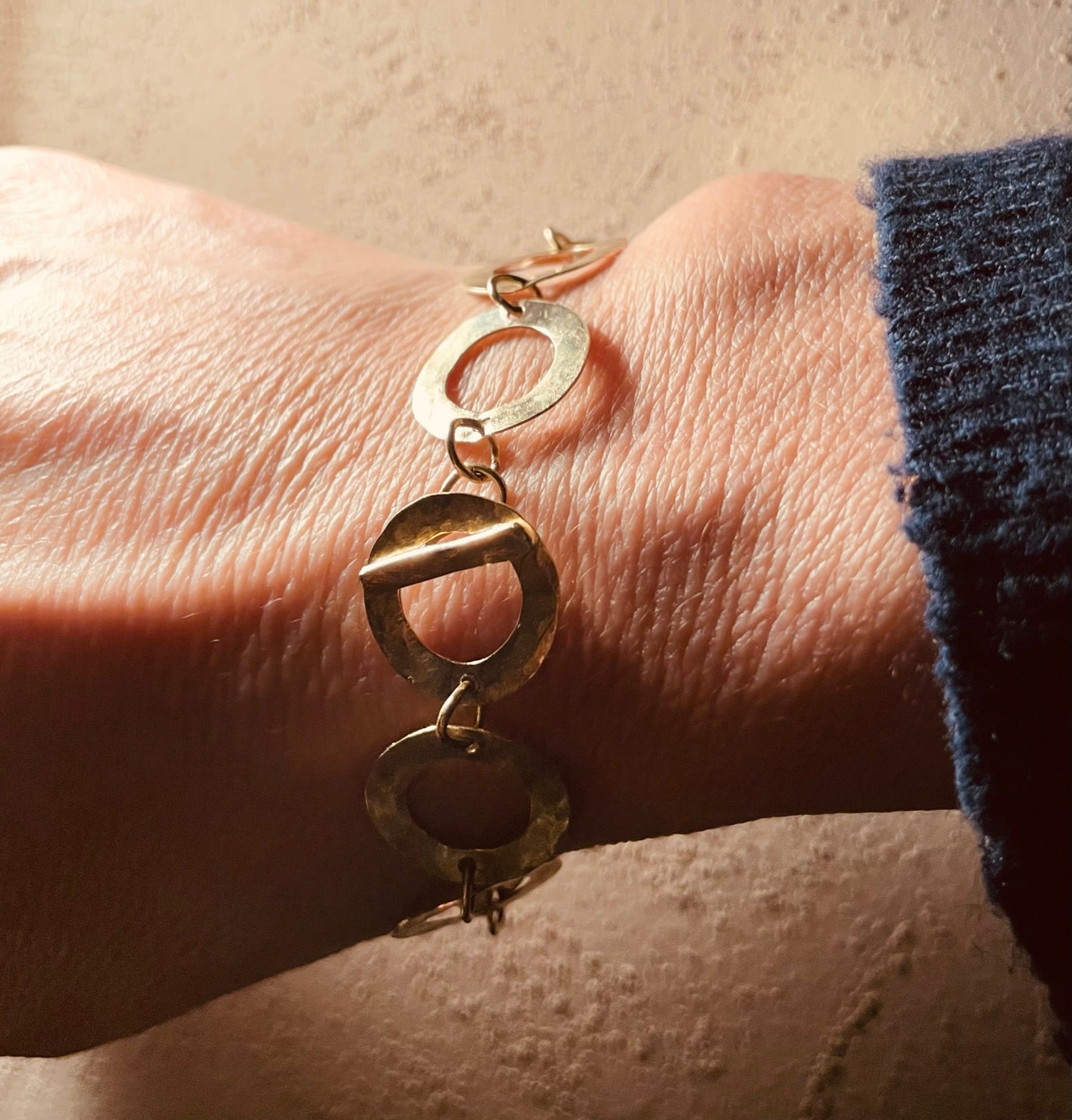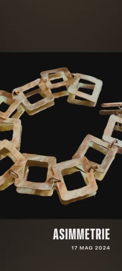 Bracciale in ottone martellato realizzato a mano. Componenti satinati uniti fra loro da anellini saldati; chiusura con gancio a 'T'.