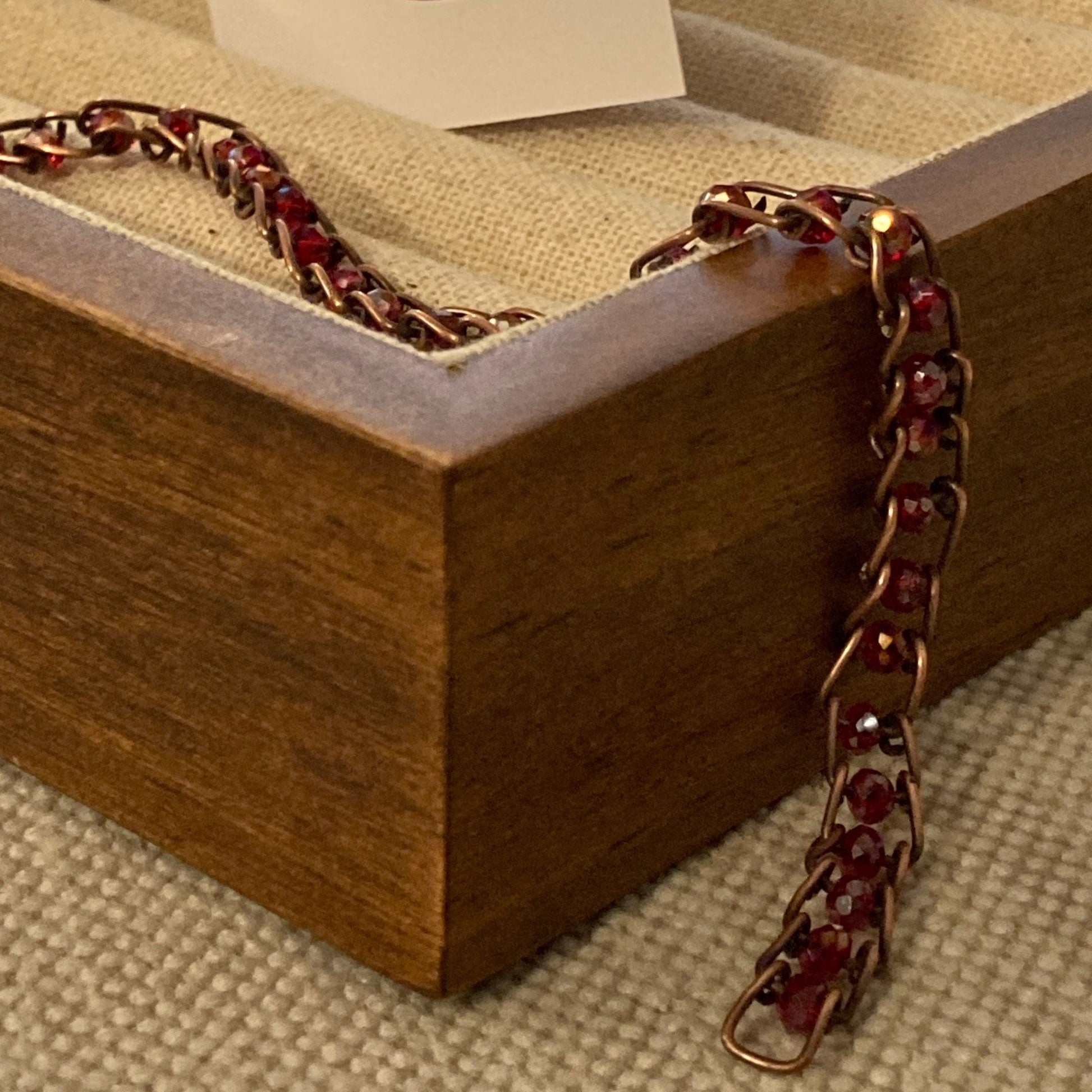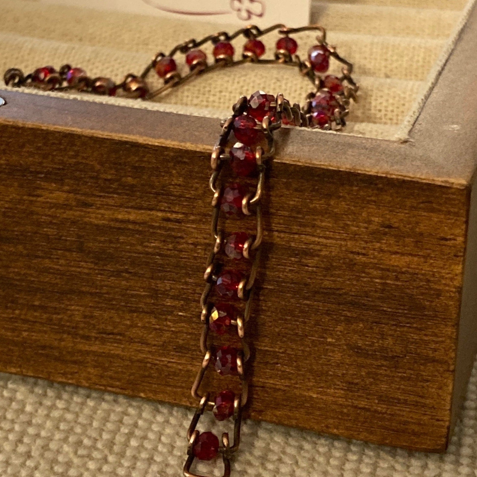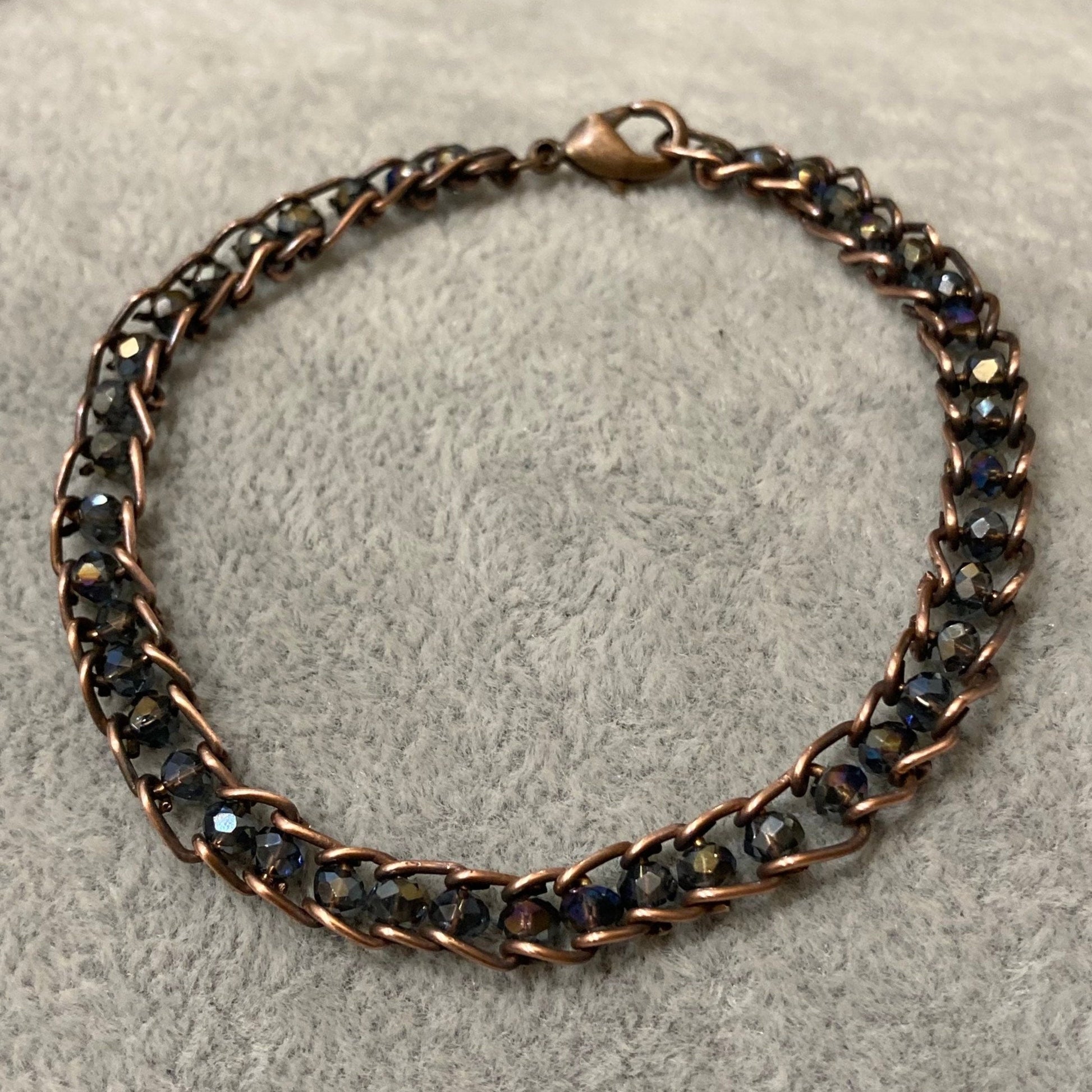 Antiqued copper bracelet, embellished with small colored crystals; attention to detail.