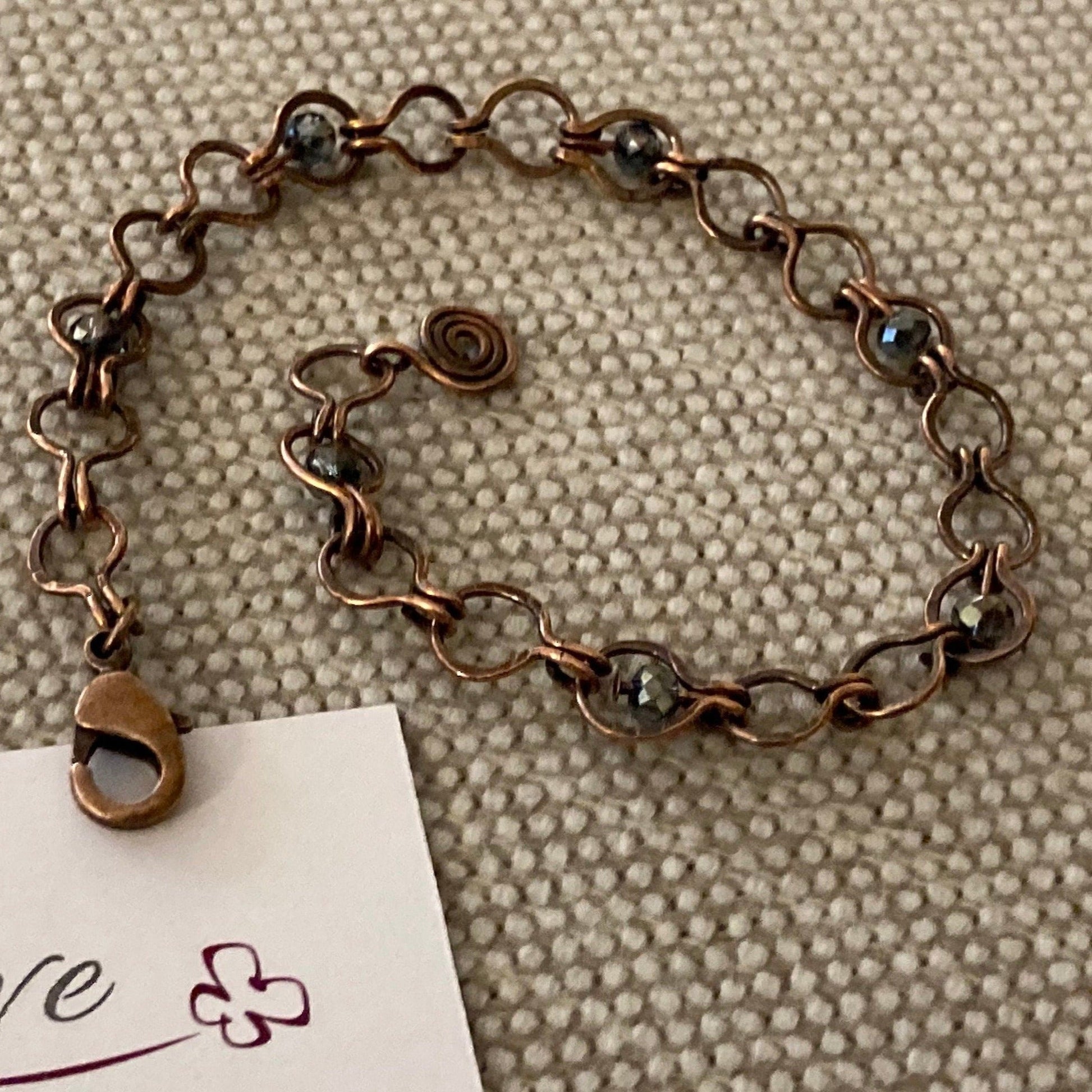 Hammered copper chain bracelet, antiqued and embellished with small crystals; mesh 0.5cm