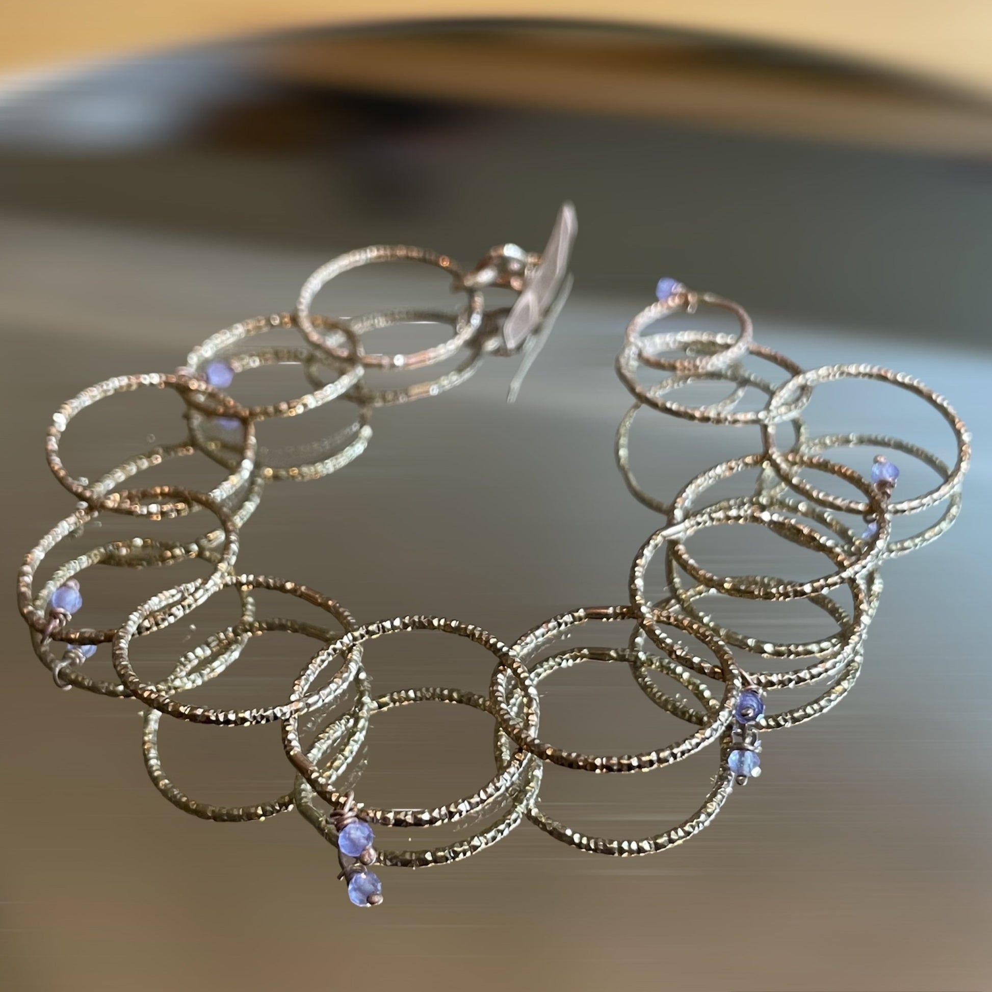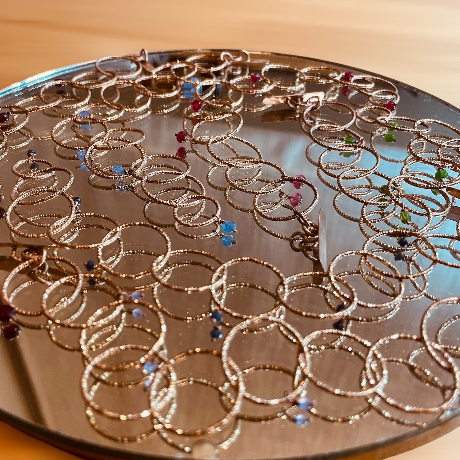 La catenella è composta da 12 anelli saldati fra loro intervallati da pietre preziose e termina con una chiusura a T; misura complessiva 18 cm, il bracciale risulta comunque regolabile.