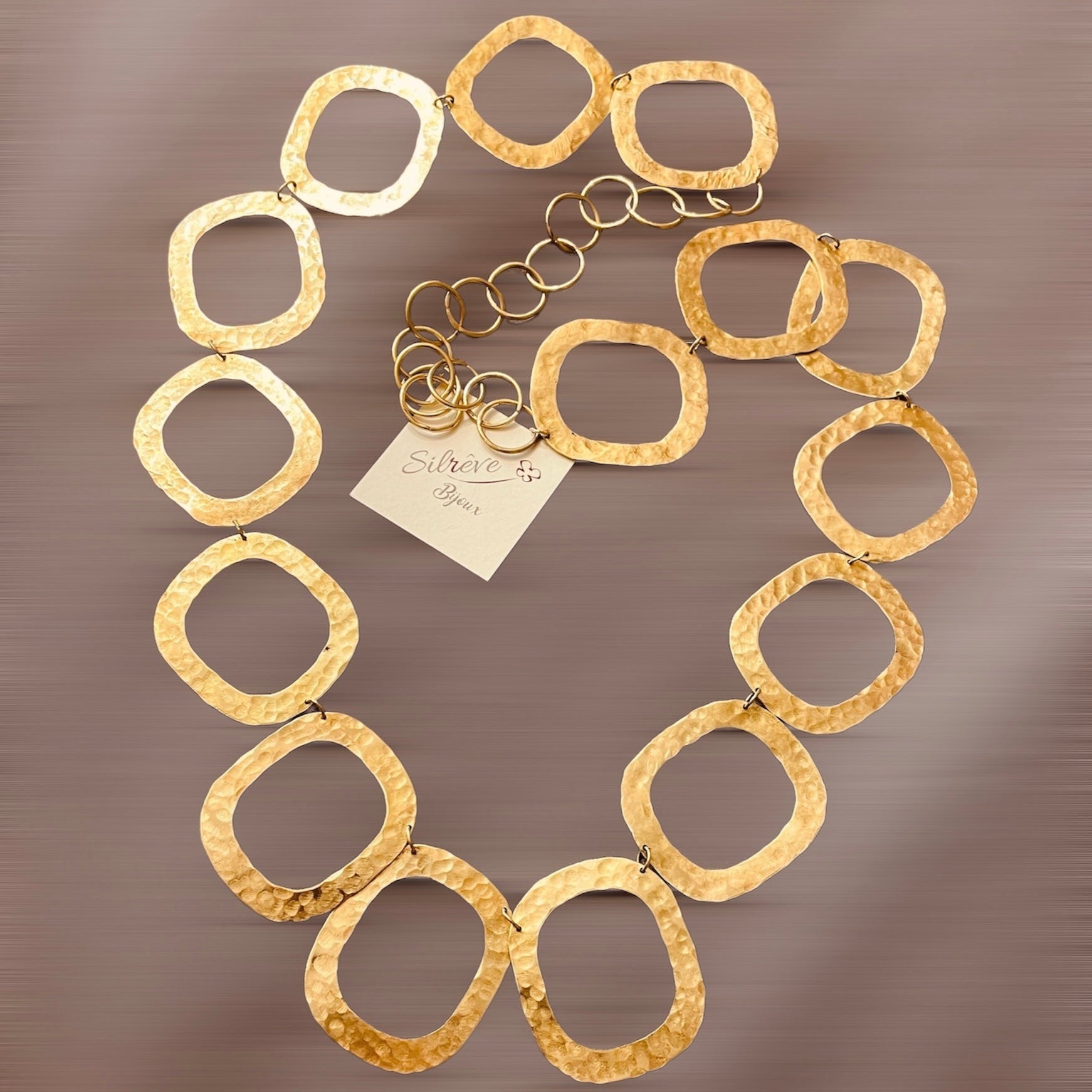 Componenti dalla forma quadrata leggermente tondeggiante, uniti fra loro da piccoli anelli saldati che invitano i pezzi a una posizione determinata e fissa. Pezzi martellati irregolarmente donano al bijoux una luce irregolare.