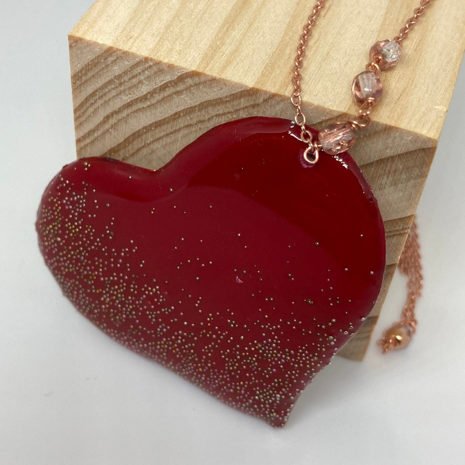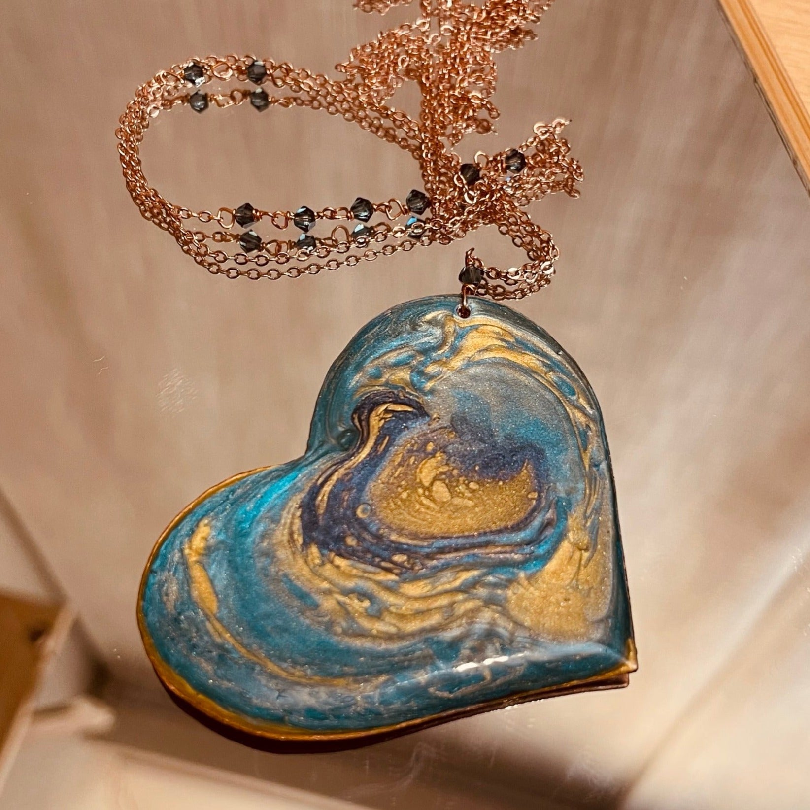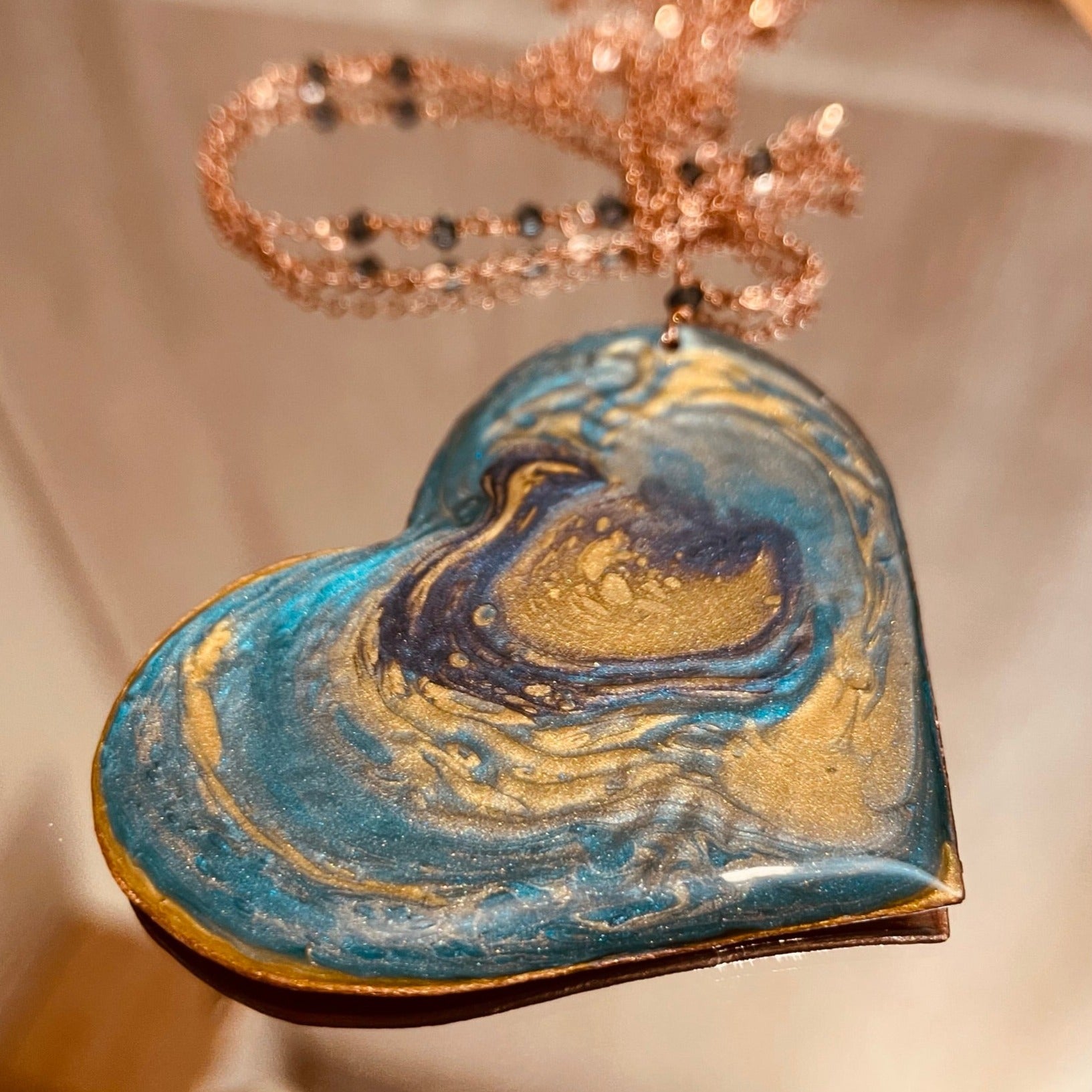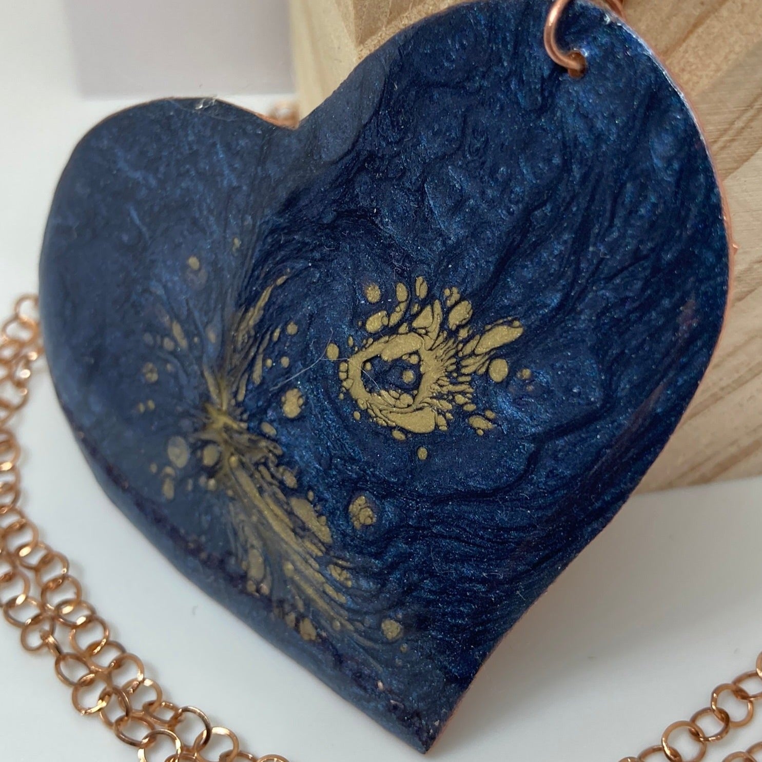 Copper necklace with vitrified and hand painted square pendant, on both sides, with enamels in elegant and sophisticated colors embellished with amethyst pearl.