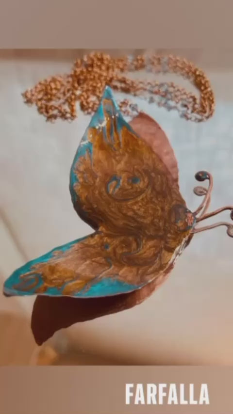 Collana in rame realizzata a mano con ciondolo a a farfalla vetrificato con smalti dai colori eleganti e sofisticati impreziosita con cristalli in tinta.