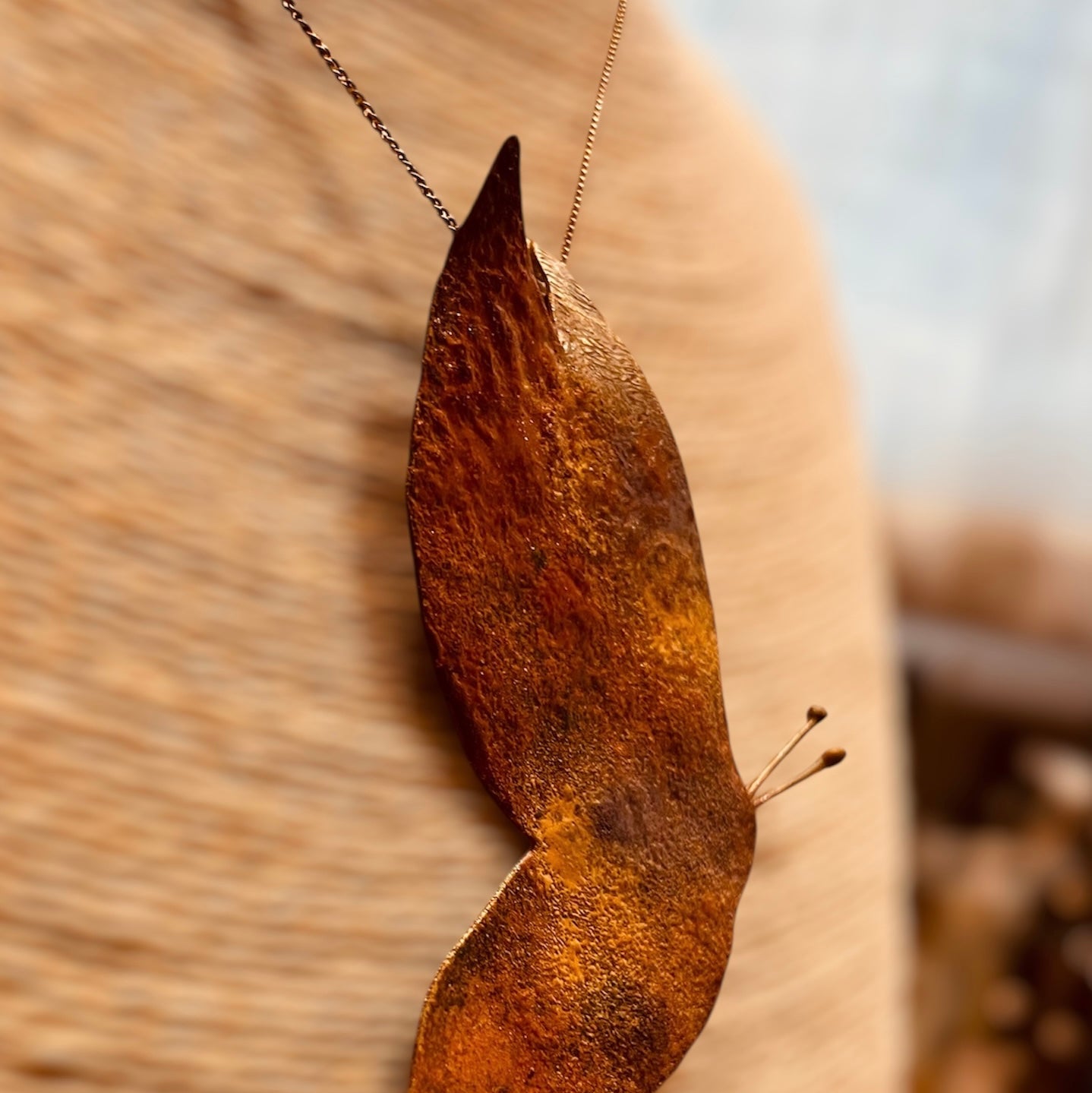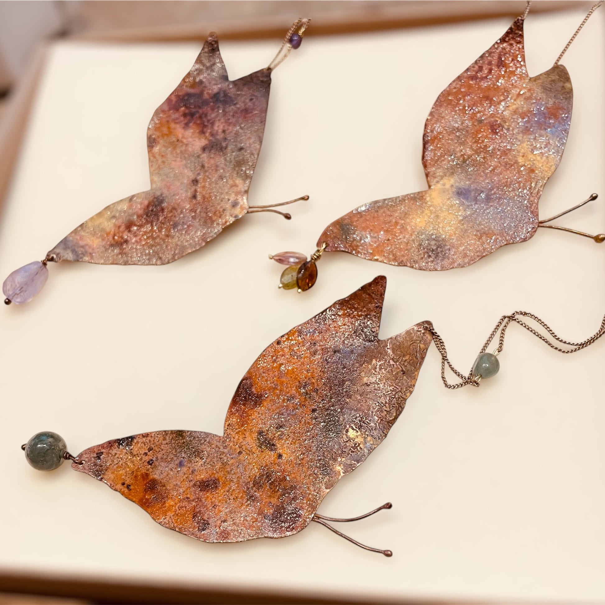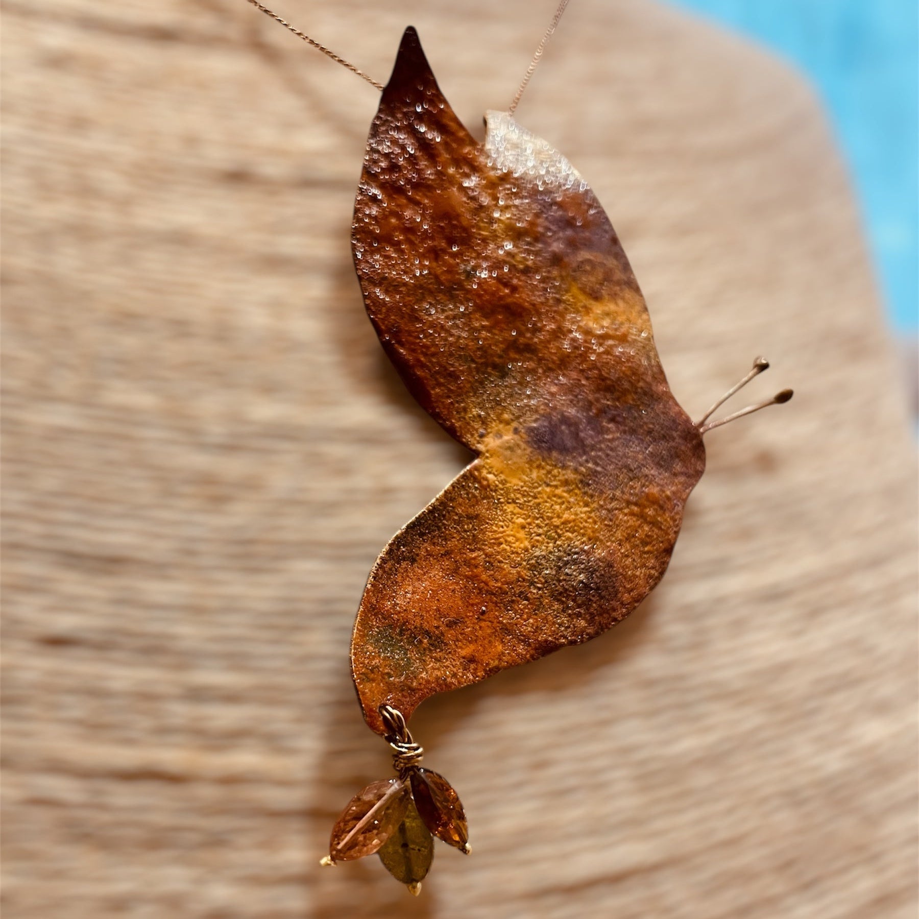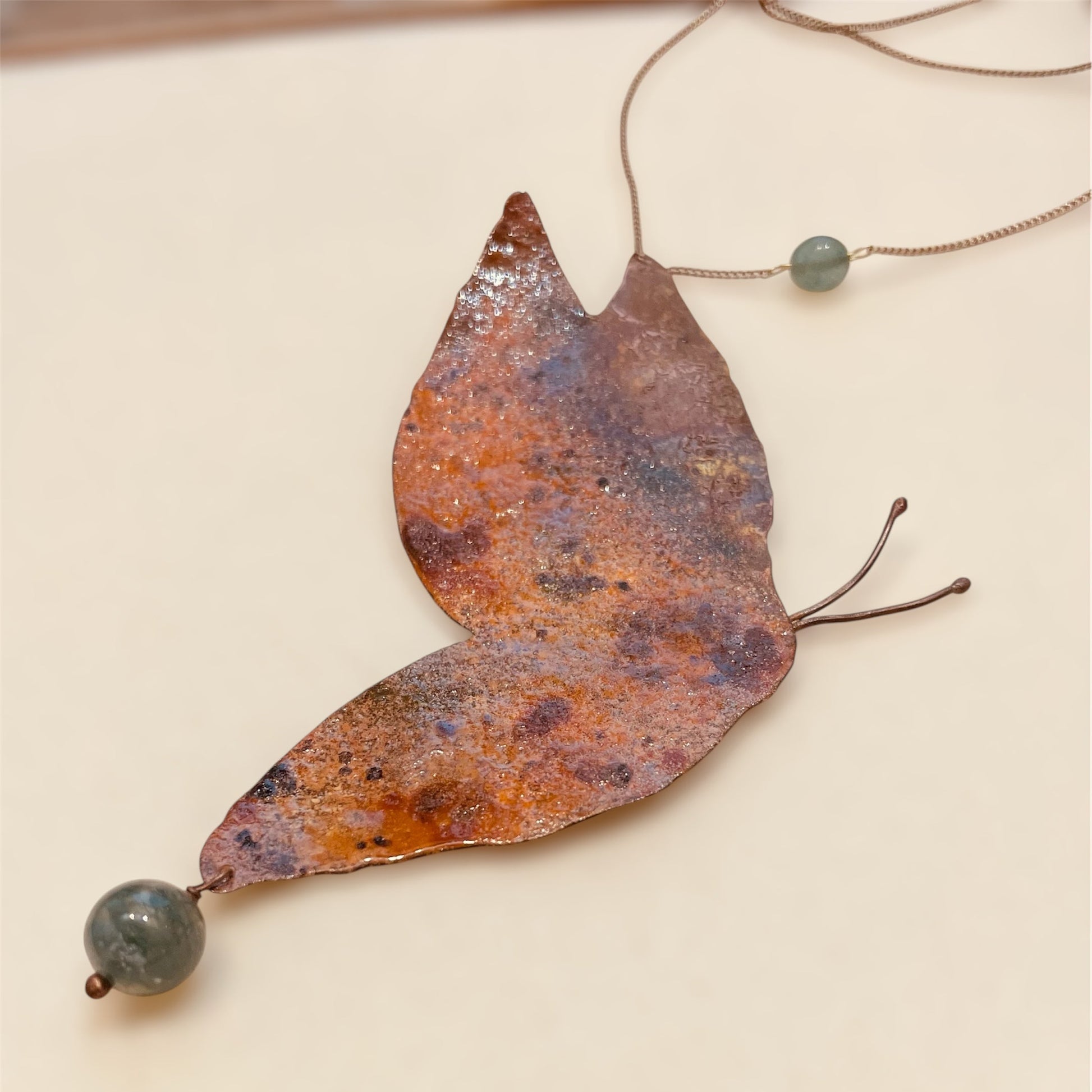 Il vero protagonista è il ciondolo: una farfalla lavorata a mano, simbolo di libertà e leggerezza. Decorata con polveri di vetro, la farfalla assume tonalità screziate che evocano i colori caldi e avvolgenti dell'autunno. Per impreziosire ulteriormente il design, sono state aggiunte pietre preziose come ametista, tormaline e agata, creando un perfetto equilibrio tra naturalezza e stile.