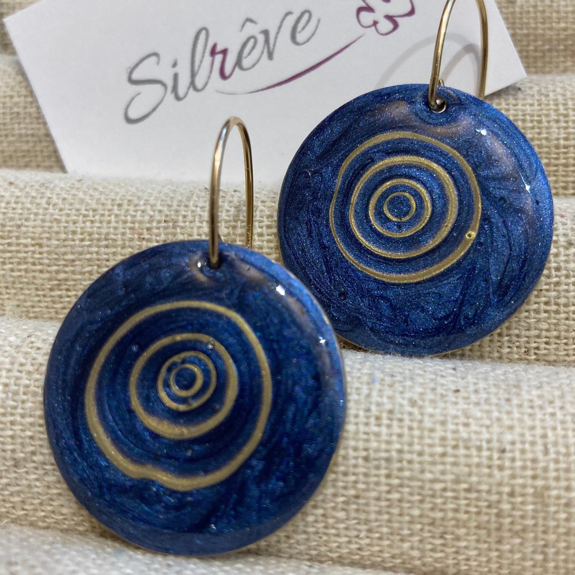 Thin concentric gold circles design the surface making the earrings unique and original.