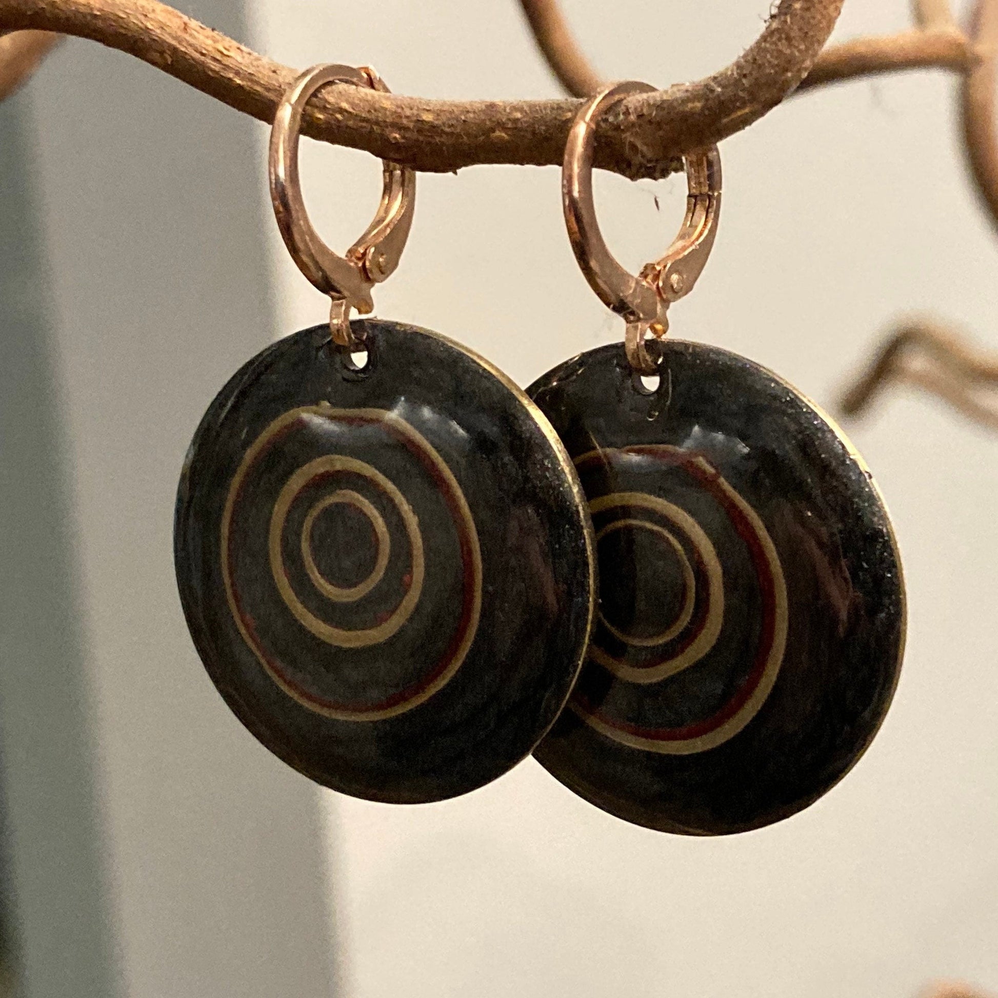 Vitrified and hand painted brass earrings with warm and sophisticated colors.