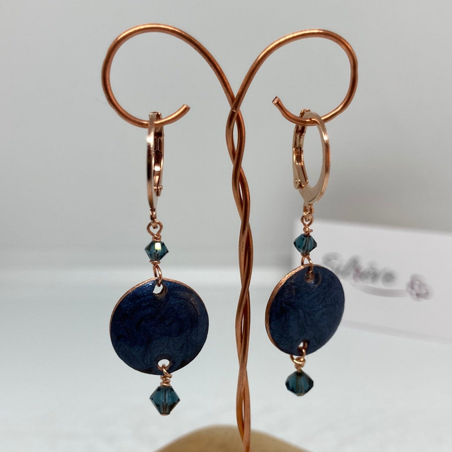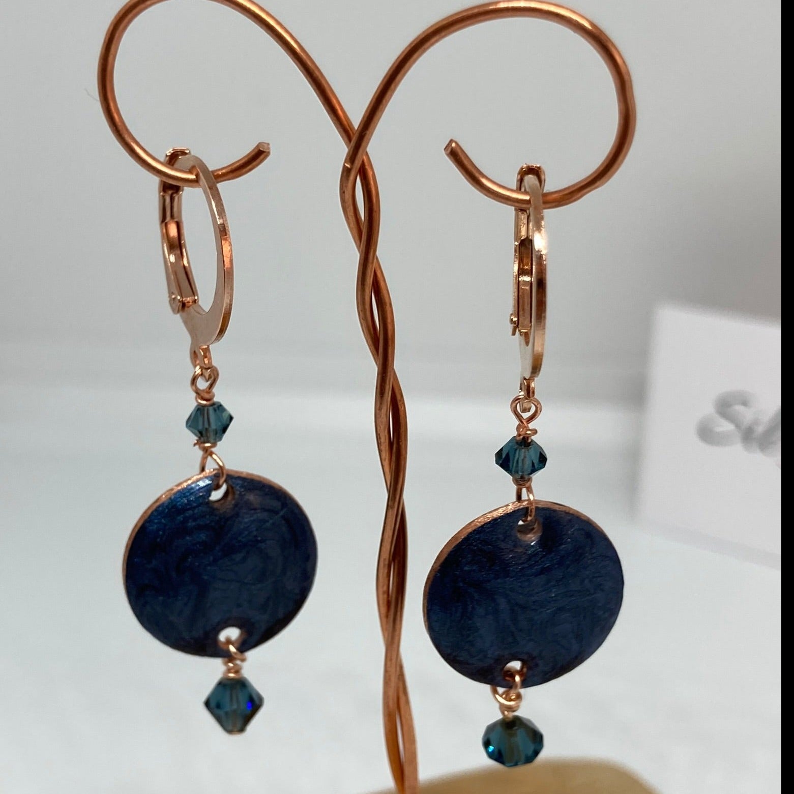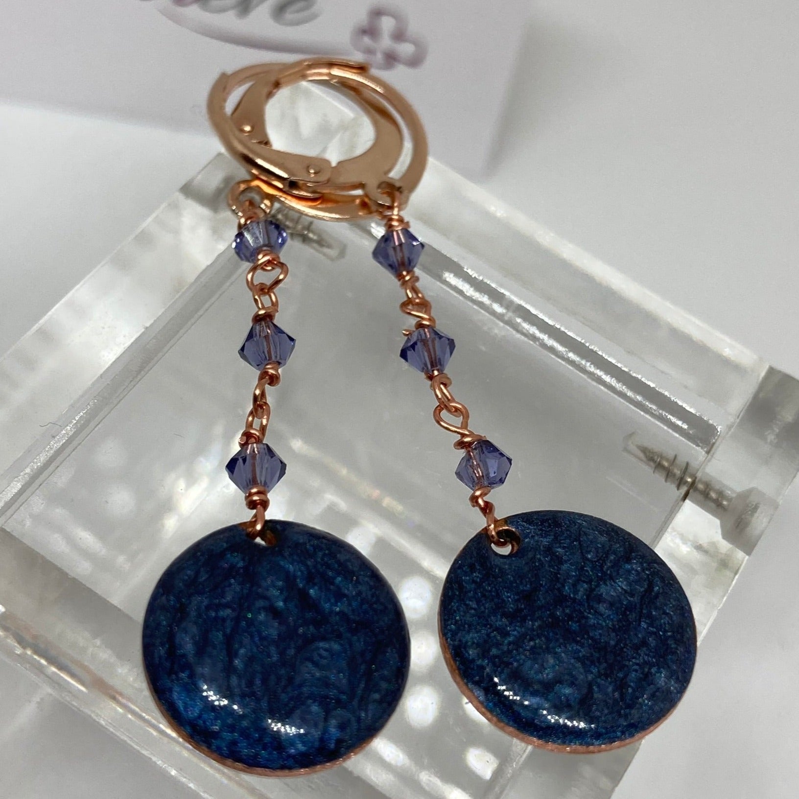 Handmade earrings (copper chain embellished with small colored crystals) with painted and vitrified pendant on both sides.