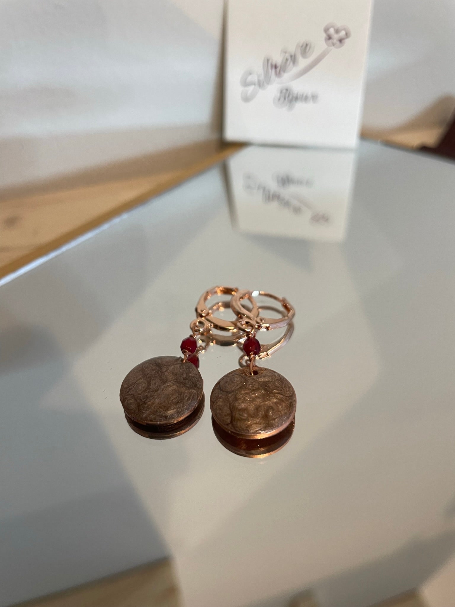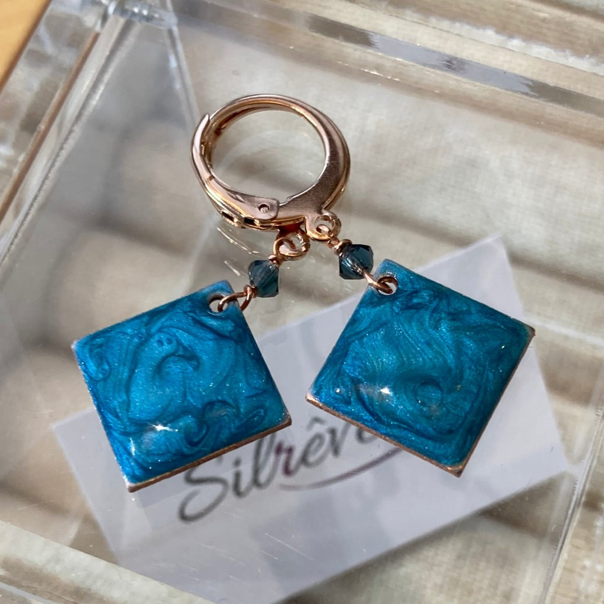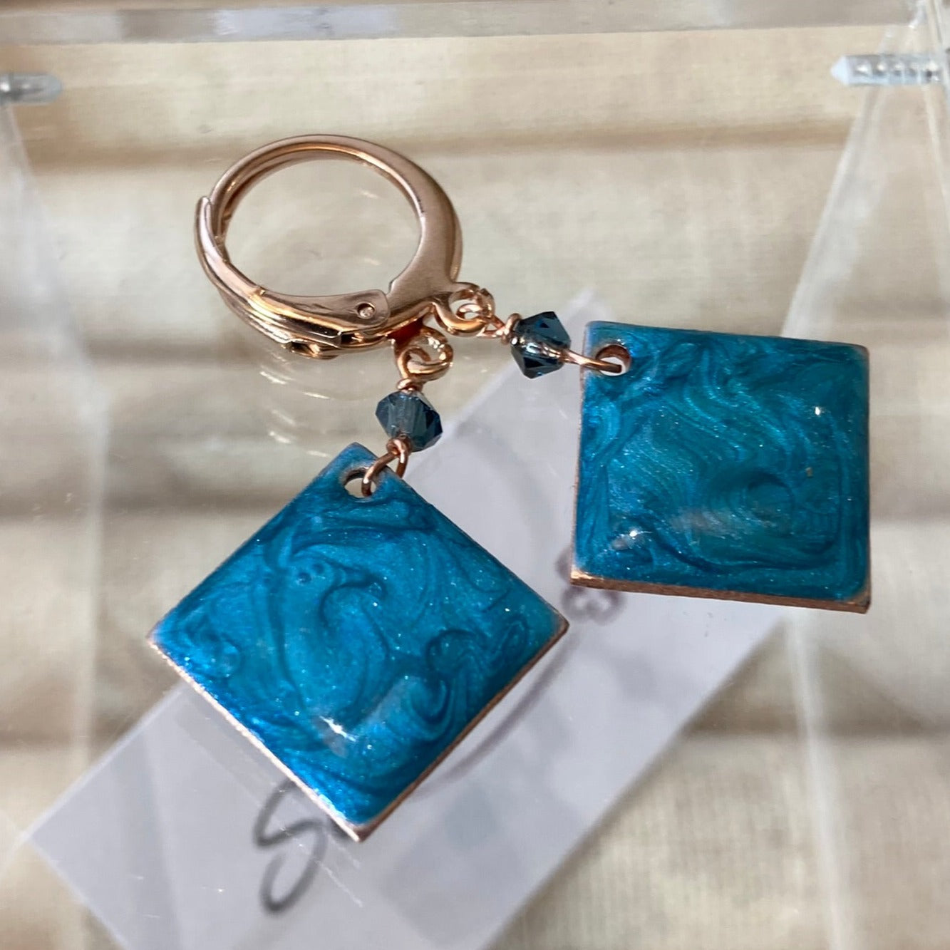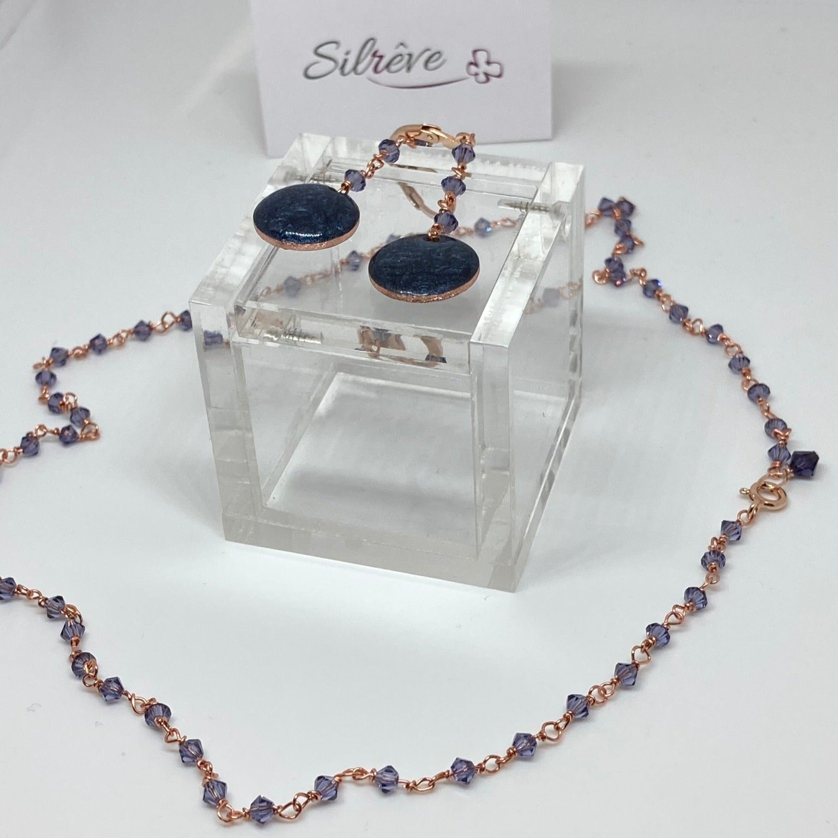 Handmade earrings (copper chain embellished with small colored crystals) with painted and vitrified pendant on both sides.