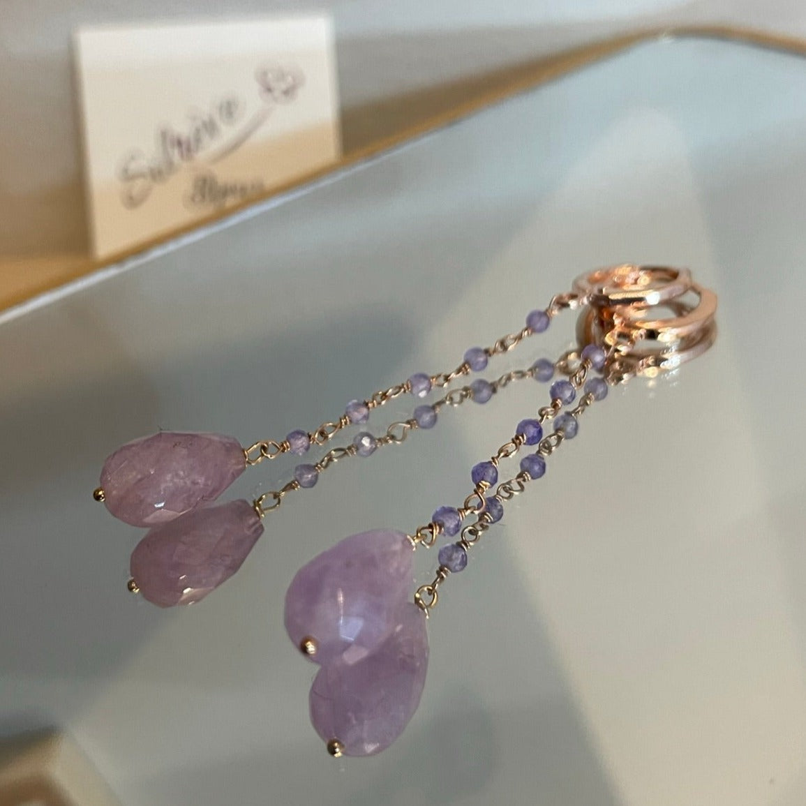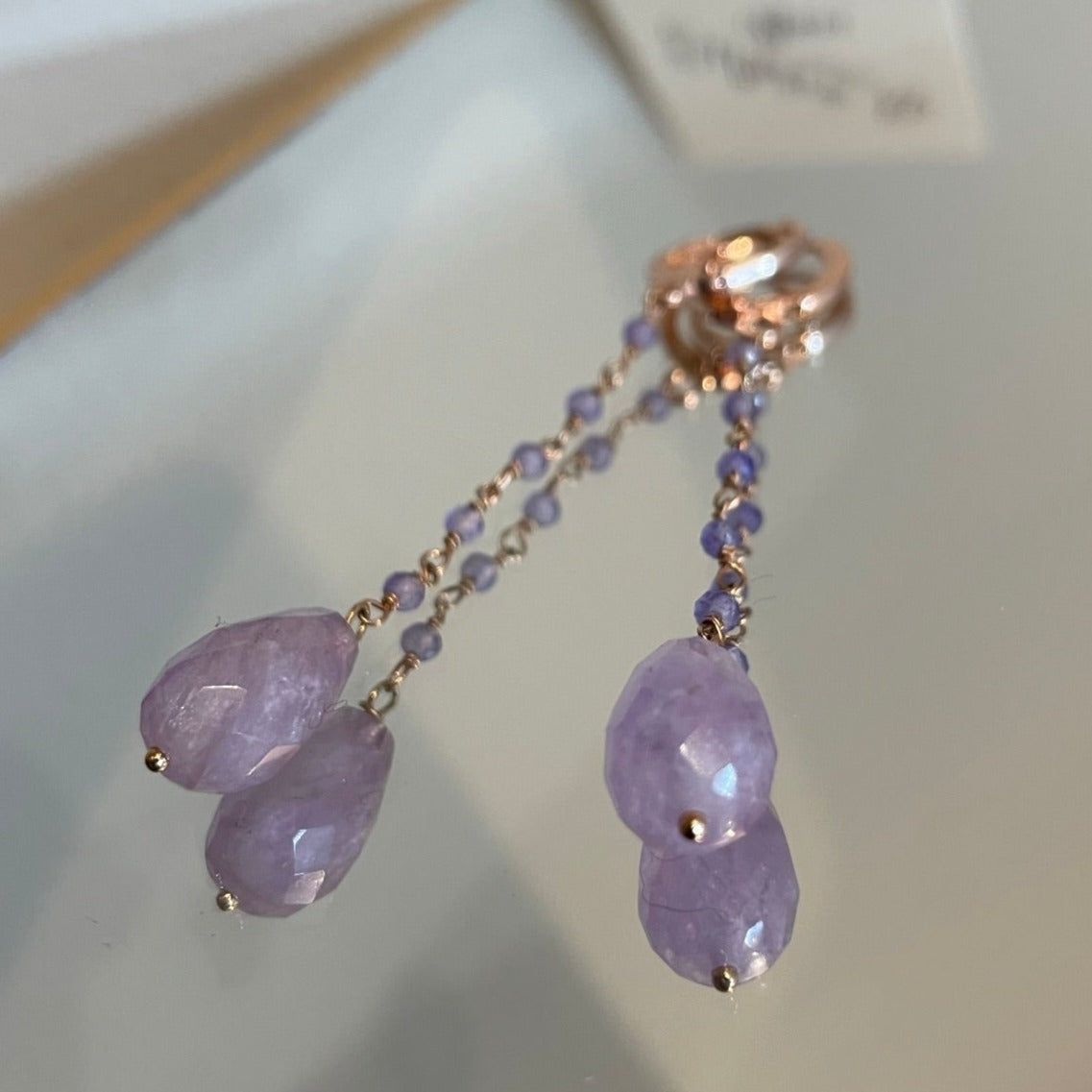 Orecchini con pietre di ametista, la parte finale del pendente è a goccia; la monachella e la catenella sono in argento 925 con una finitura rosata.
