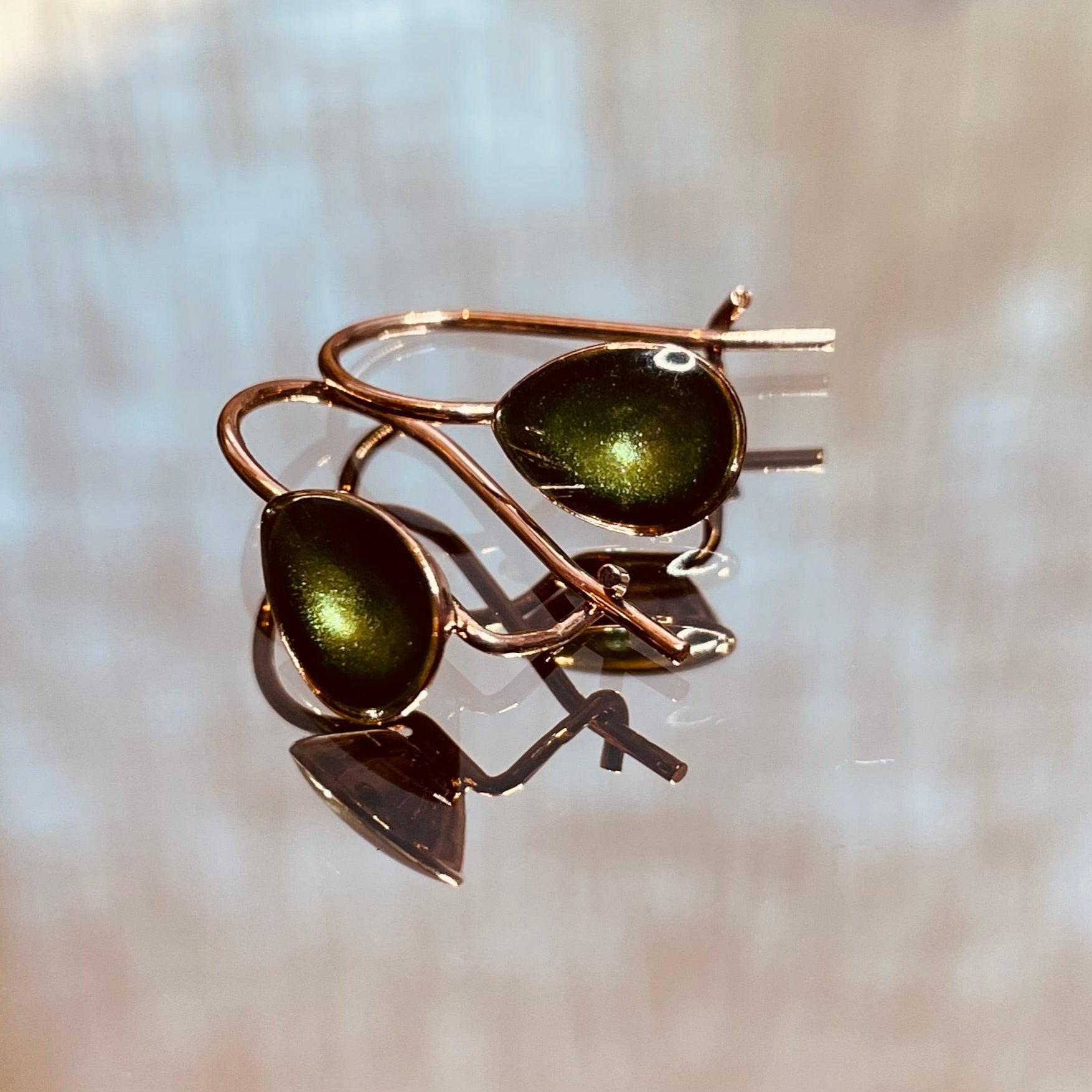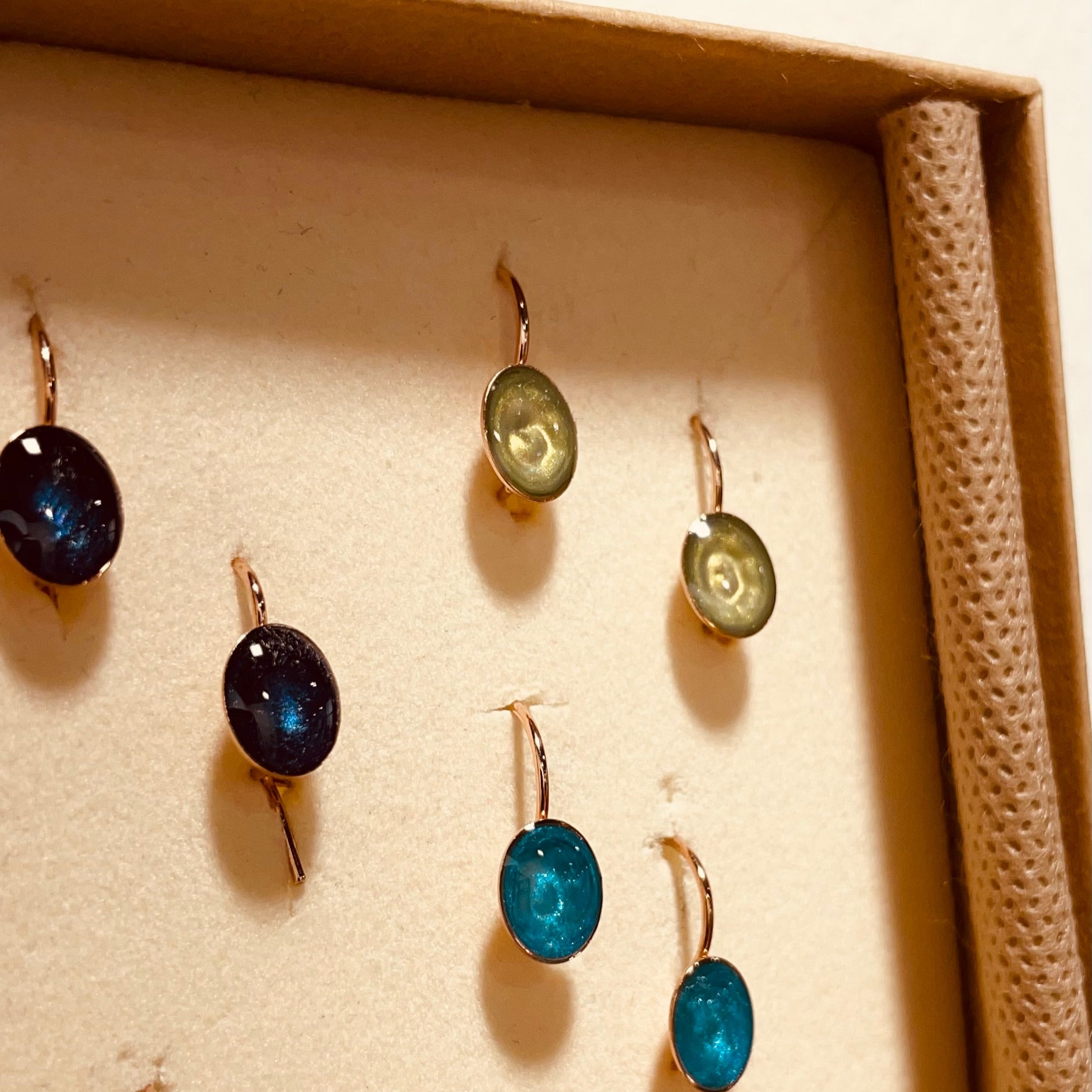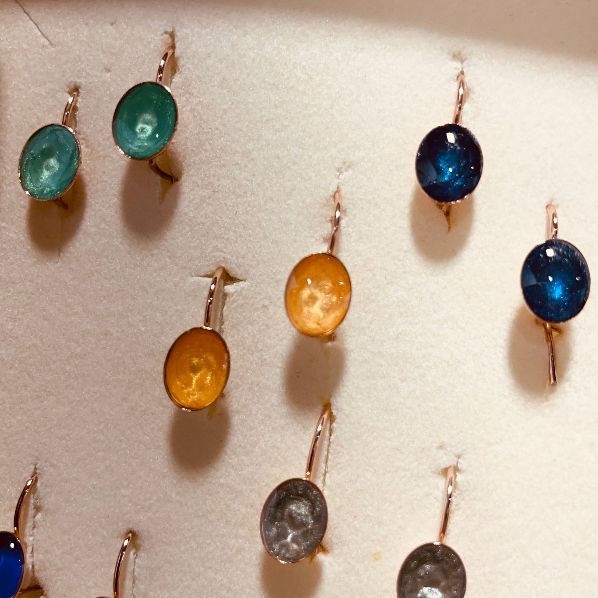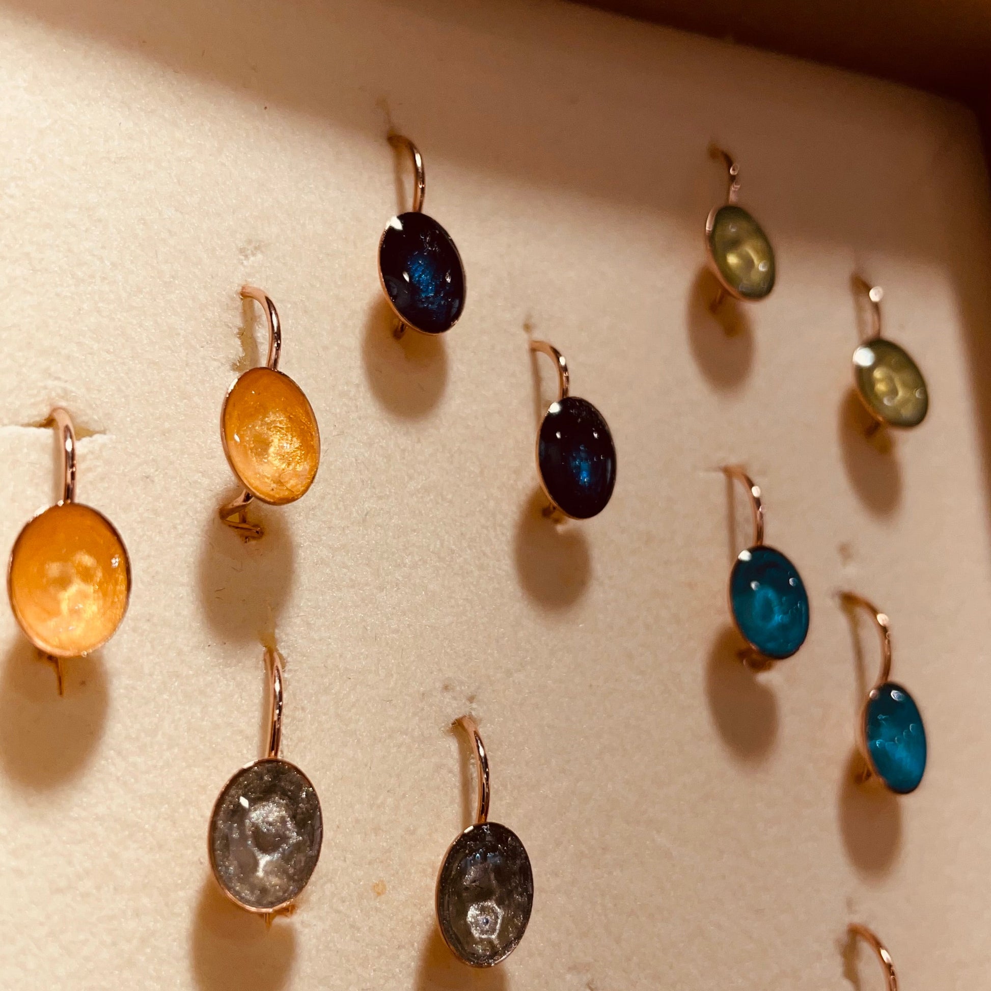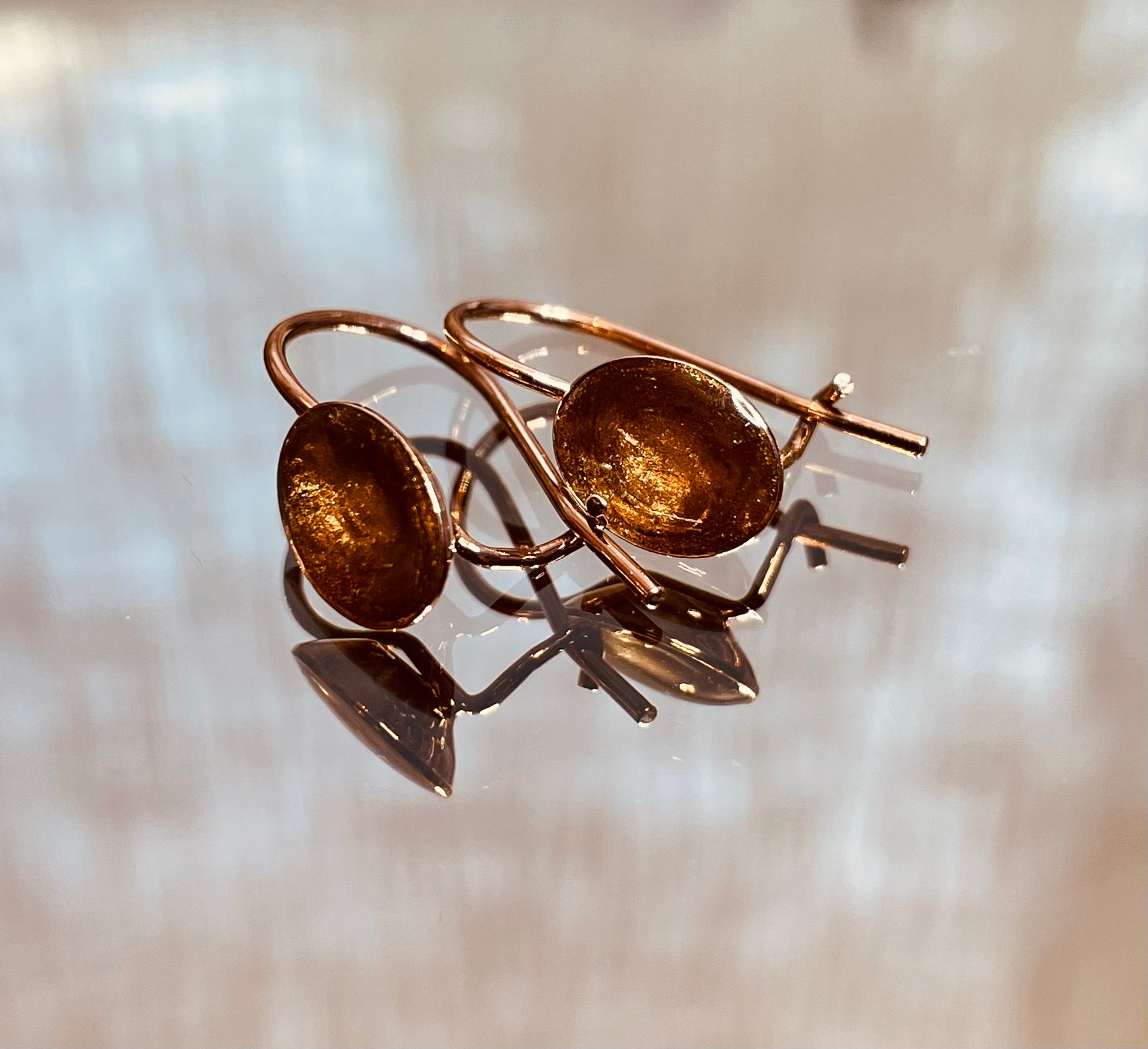 Orecchini ovali e a goccia in ottone rosato con monachella; anallergici privi di piombo, cadmio e nichel.