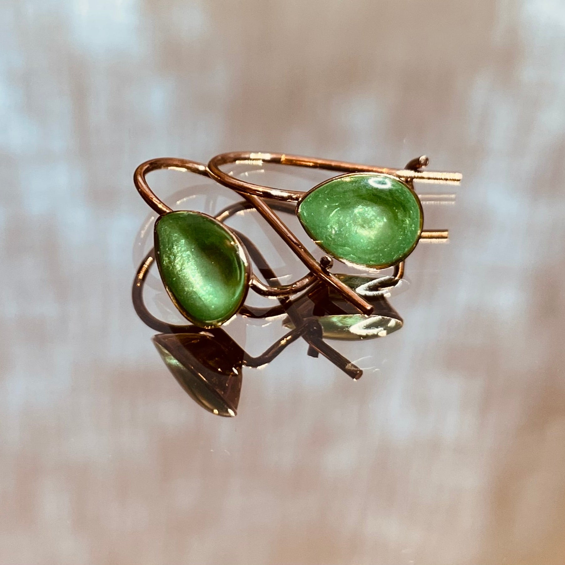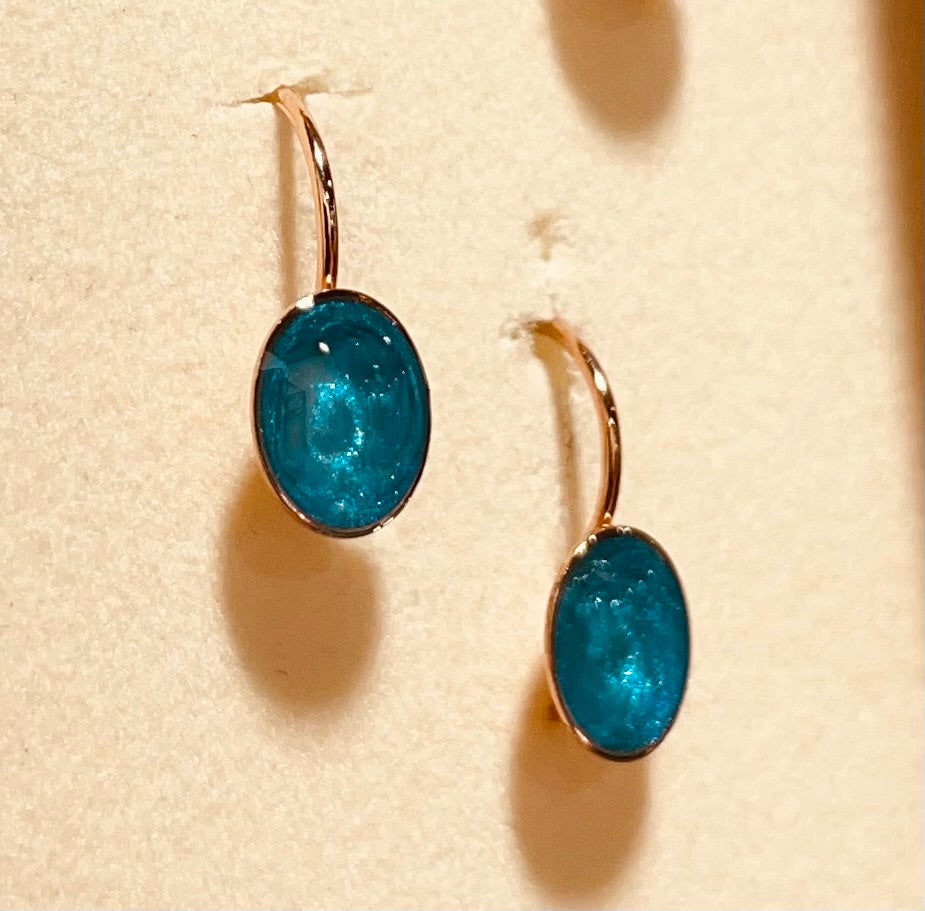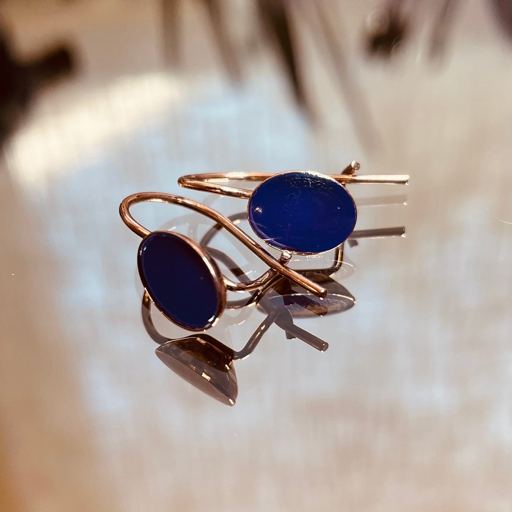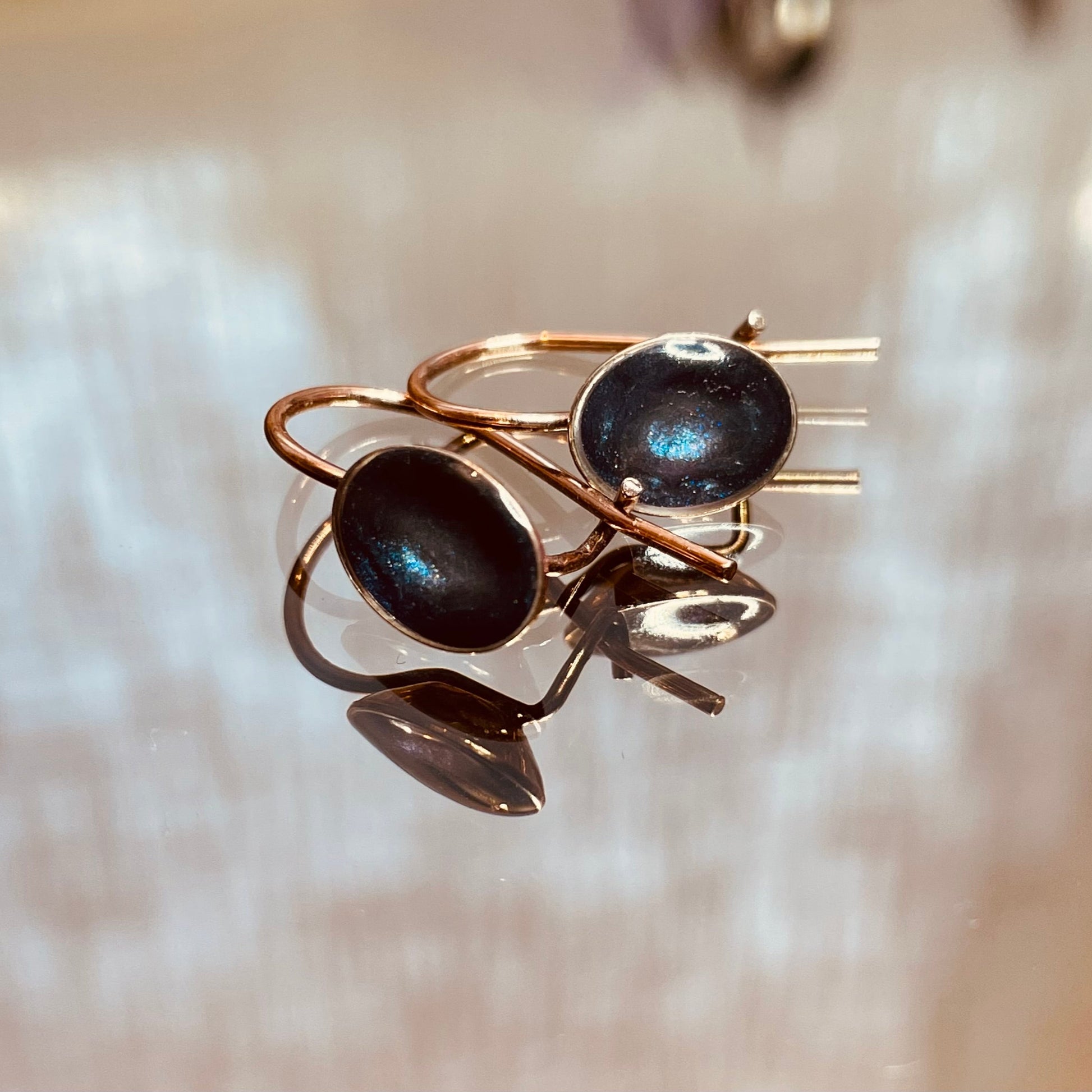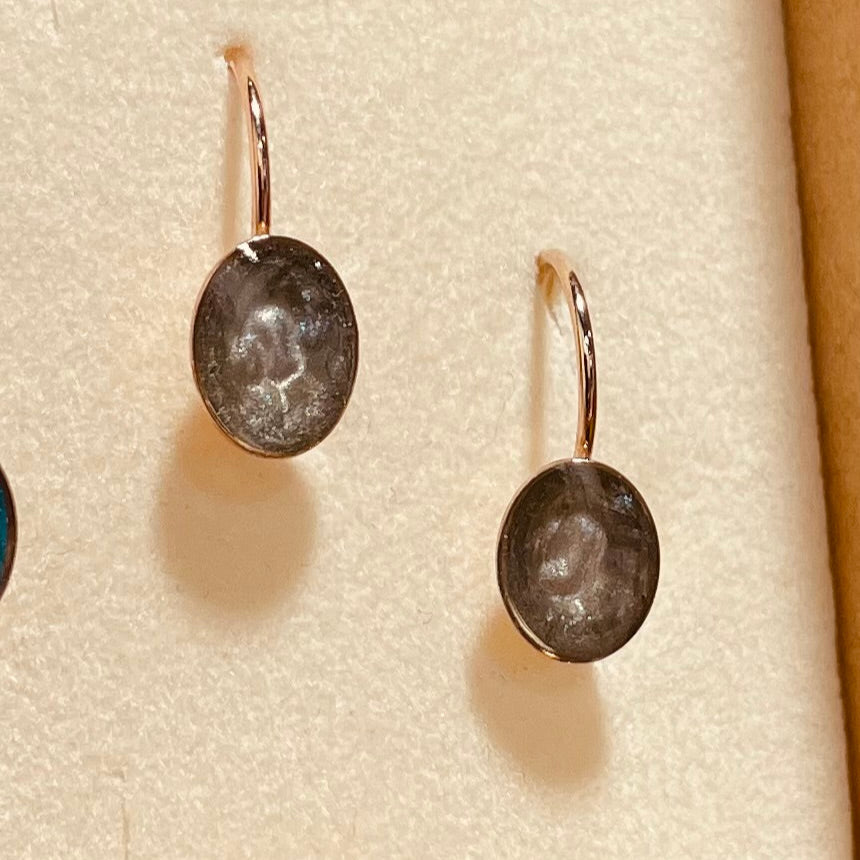 Orecchini ovali e a goccia in ottone rosato con monachella; anallergici privi di piombo, cadmio e nichel.