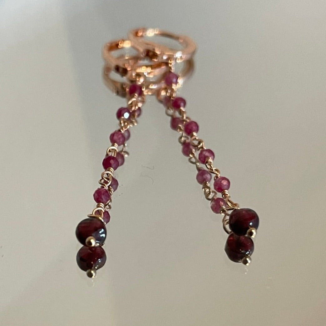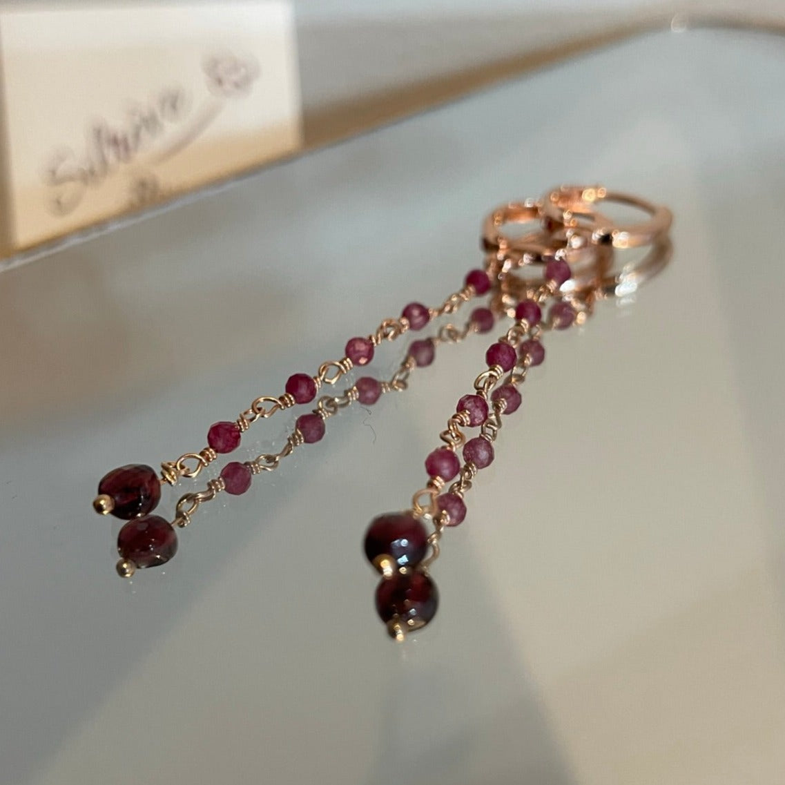 Orecchini con pietre di granato e radice di rubino; la monachella e la catenella sono in argento 925 con una finitura rosata.