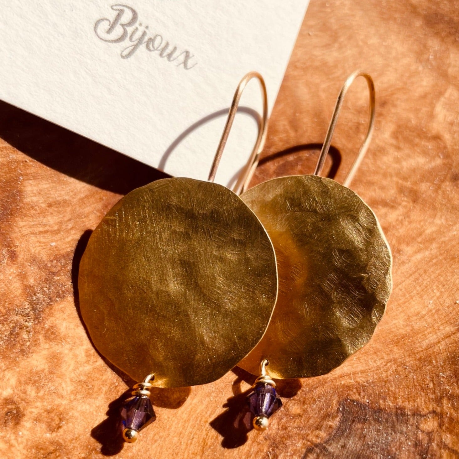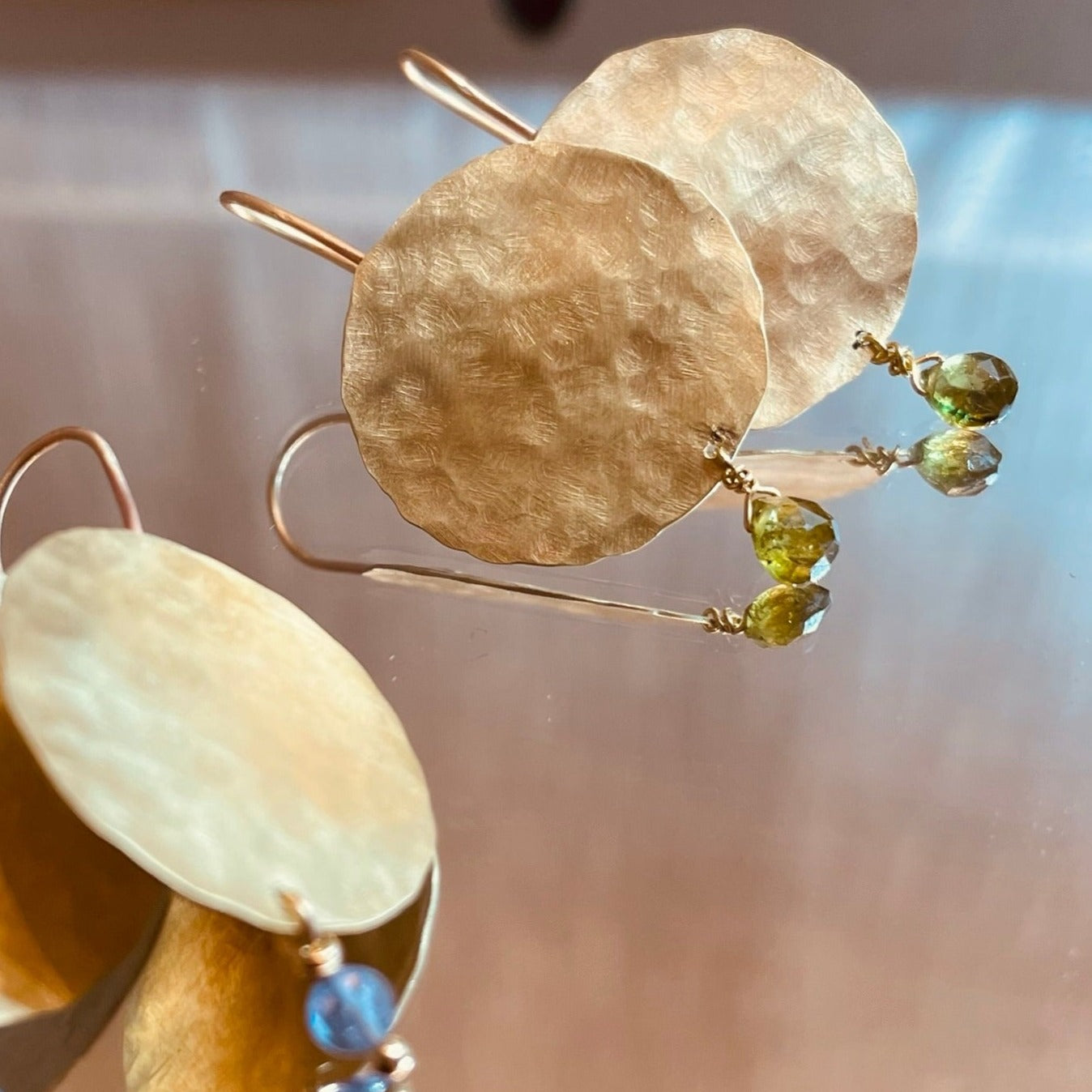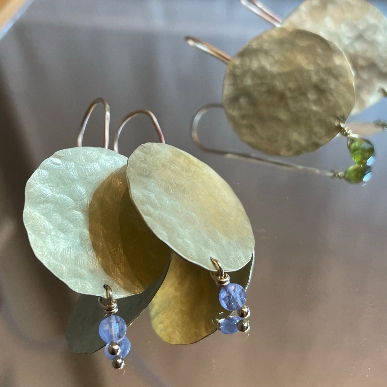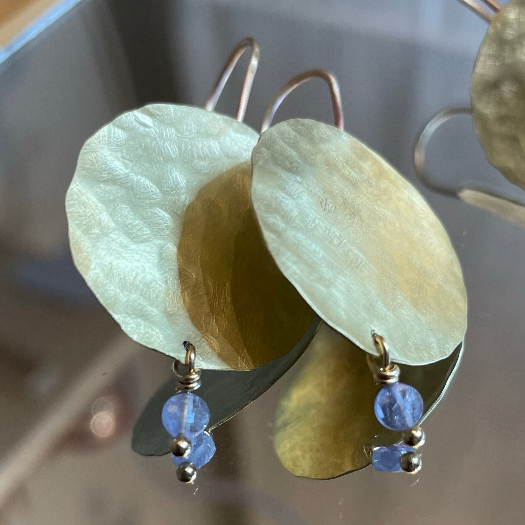 Ottone cotto, martellato, satinato e saldato con piccola pietra o cristallo colorato.